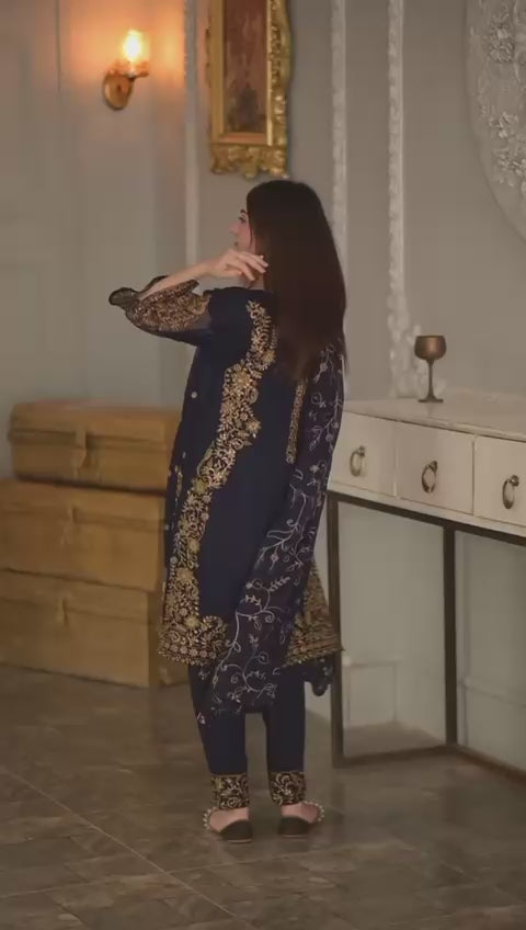Turn heads with this luxurious women's 3-piece chiffon dress set, designed for those who appreciate elegance and tradition. Featuring intricate heavy embroidery on both the front and back, this outfit showcases expert craftsmanship and timeless style. The soft, flowy chiffon fabric adds a touch of grace, while the coordinated embroidered dupatta and straight trousers complete the refined look. Ideal for festive occasions, weddings, or formal gatherings, this suit effortlessly blends sophistication with cultural flair.
